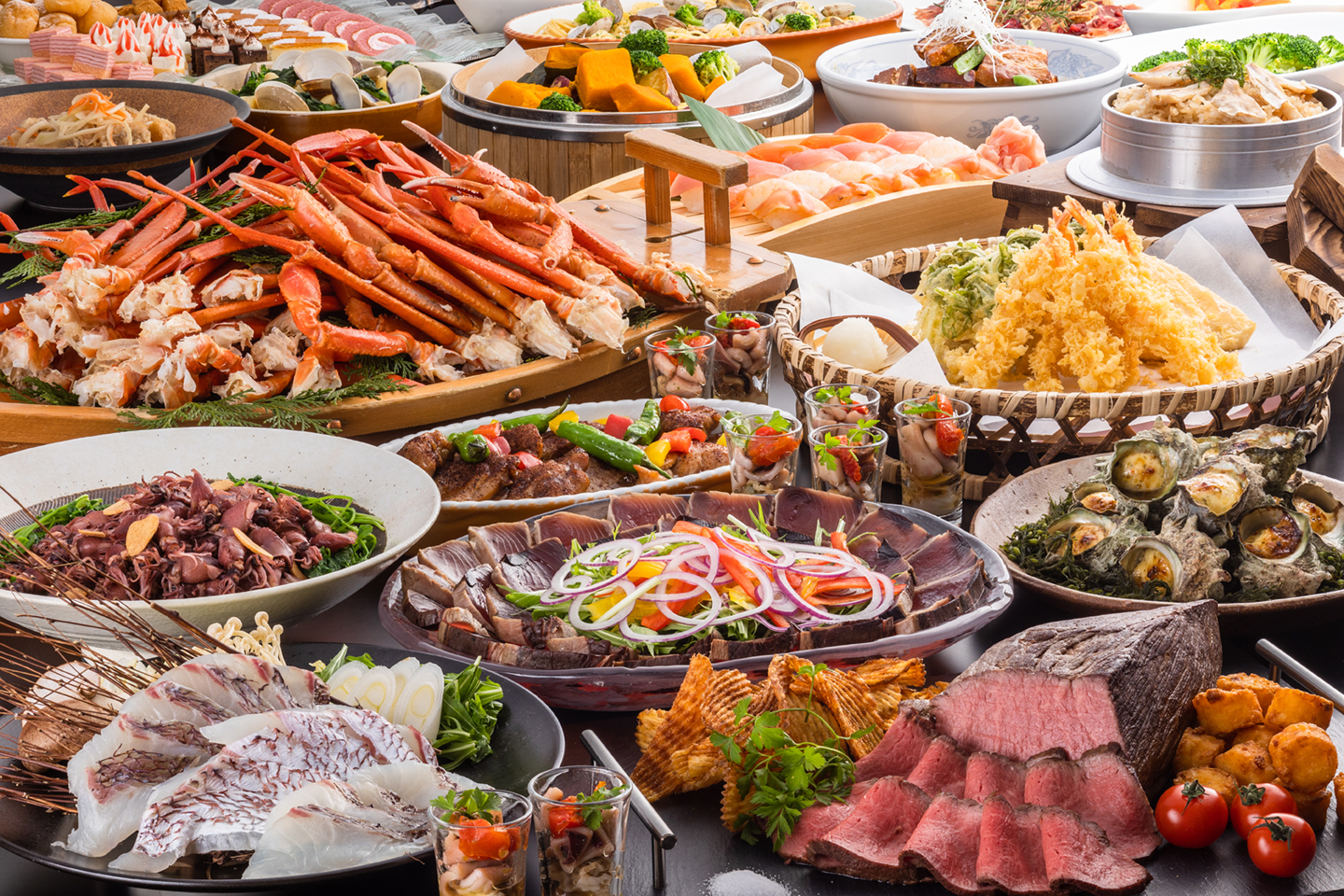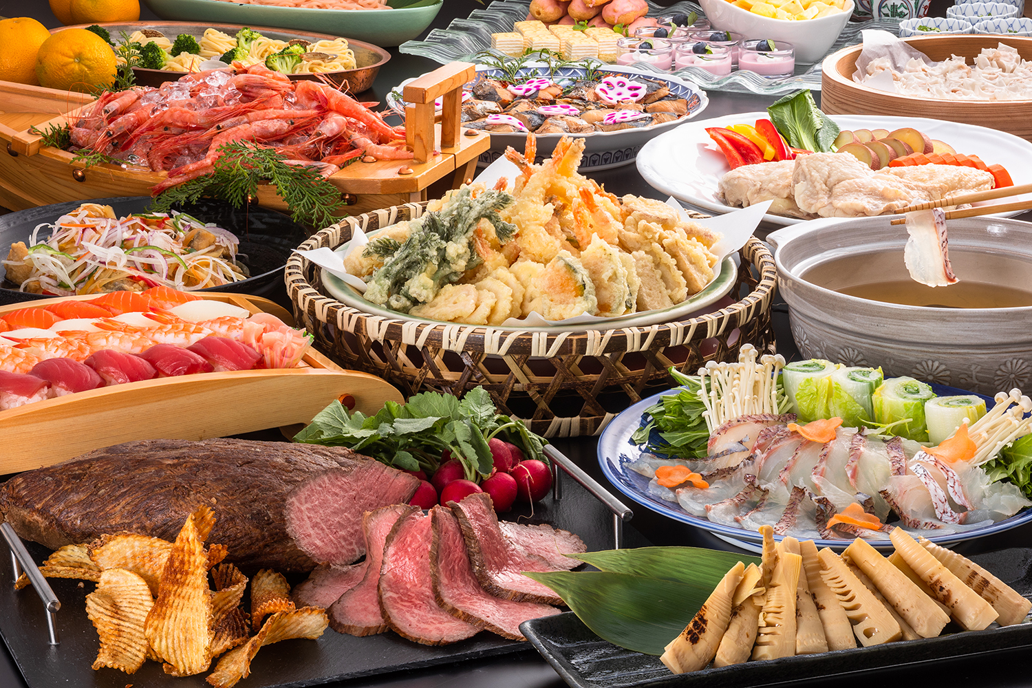 1年を通して季節に応じた欧風料理や和の献立は約50種。ライブキッチンと充実したデザートコーナーもお楽しみくださいませ。